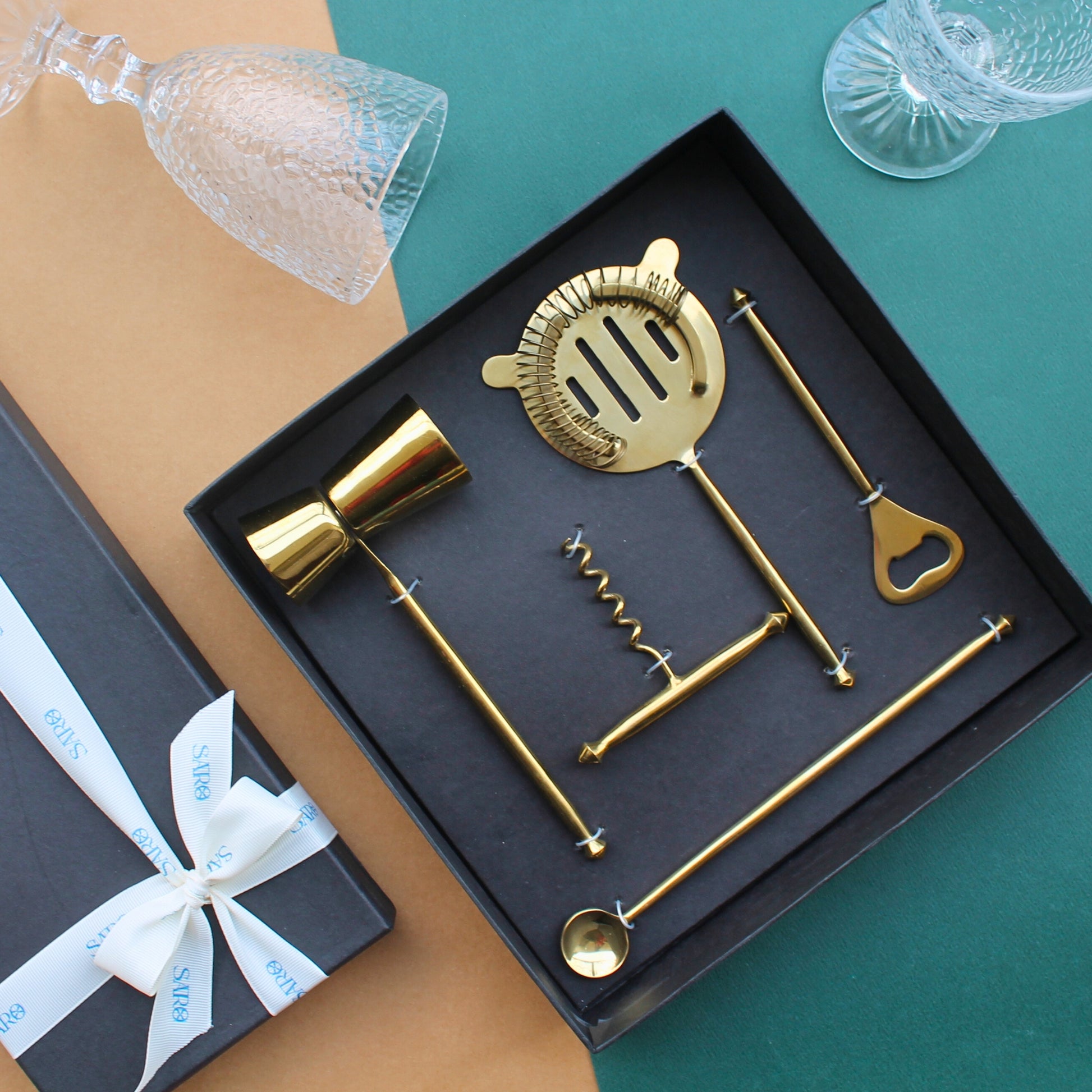 Mix like a pro. SARO’s Aurum Bar Tools Set brings sophistication and function to your home bar. Finished in a radiant gold tone and packed in a premium gift box, this 5-piece kit is a must-have for stylish entertainers.