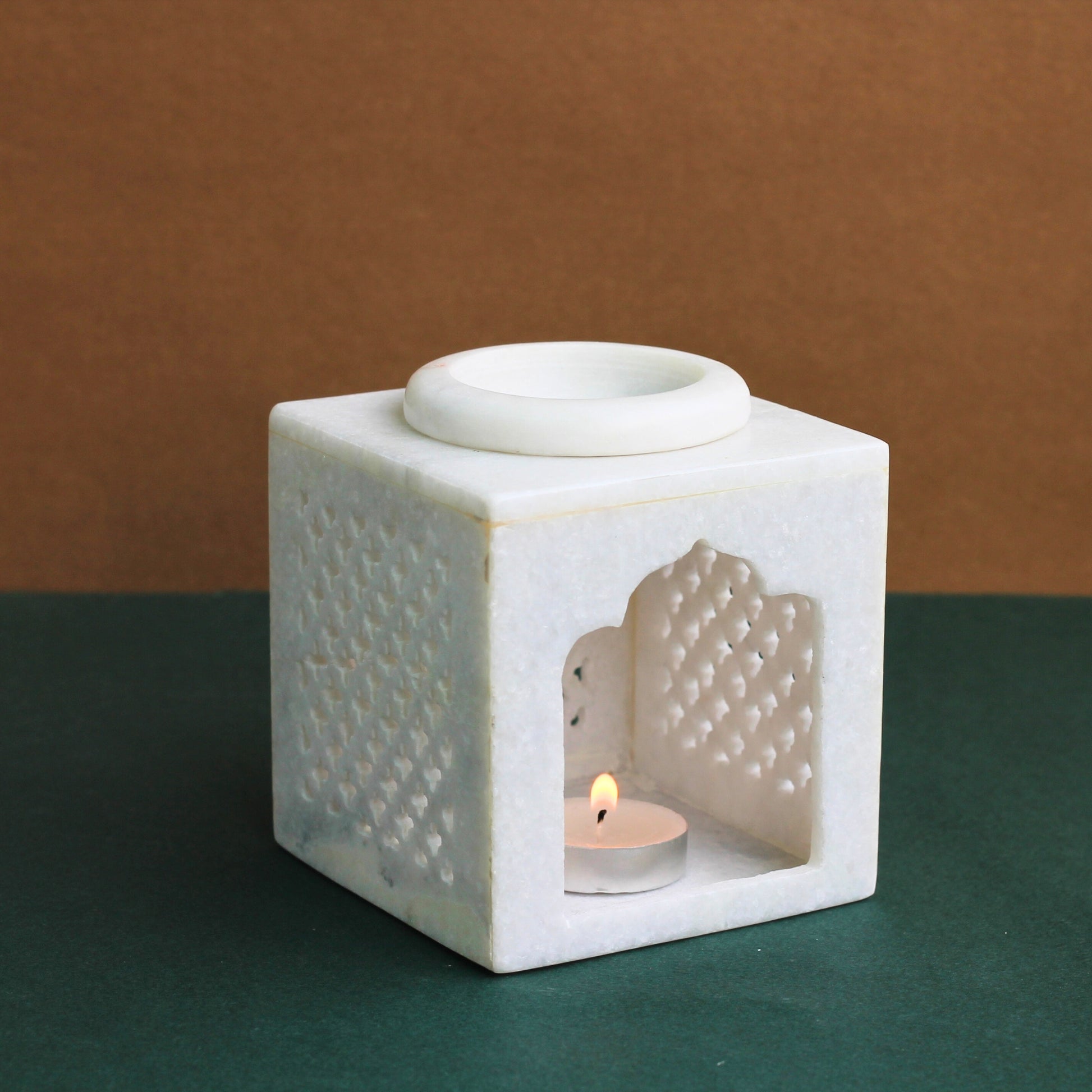 Bring timeless elegance into your home with the Dome Marble Diffuser, handcrafted from pure marble by skilled artisans. Its cube-shaped design with intricate jali (lattice) carving reflects the charm of traditional Indian craftsmanship. At the same time, the dome tray on top makes it perfect for adding your favorite essential oils or fragrance blends. Light a tealight inside, and watch as the soft glow filters through the hand-carved patterns, creating a soothing ambience while diffusing gentle fragrance.
