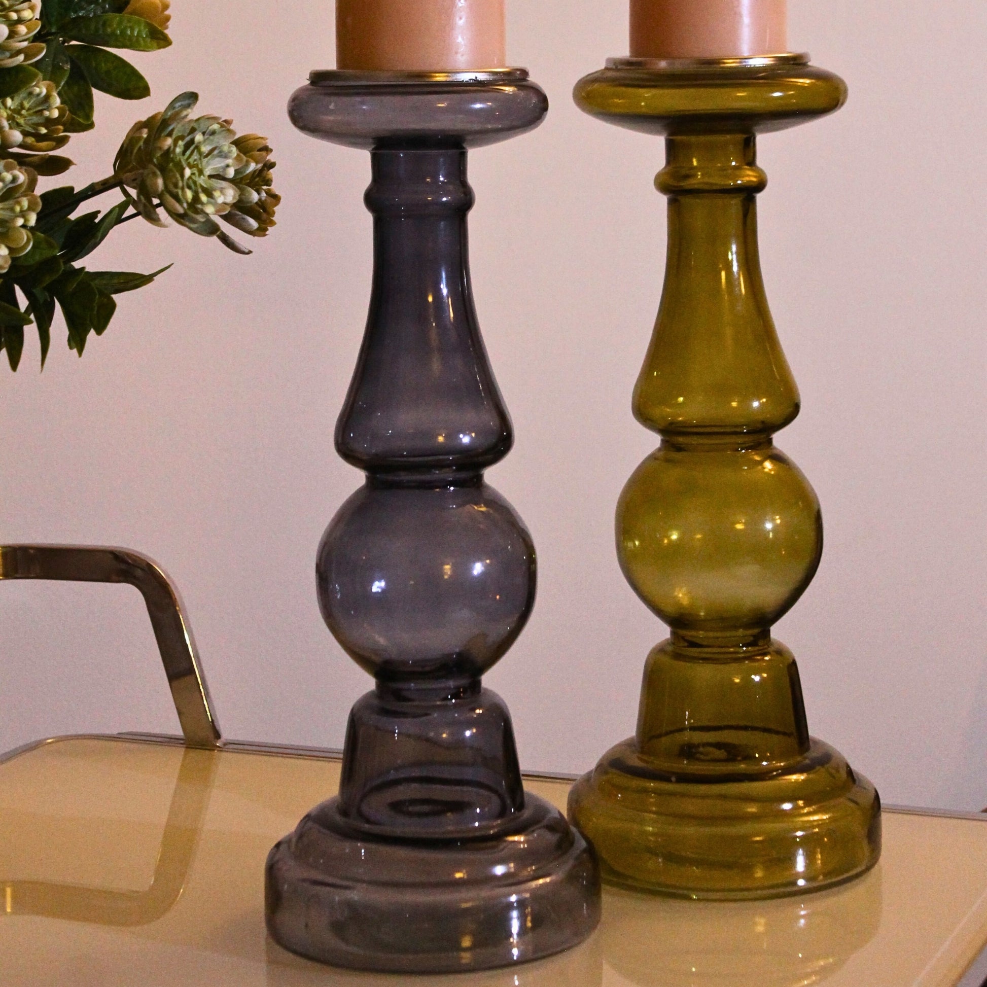 These Figurative Glass Candle Stands combine timeless form with a warm, golden glow that instantly uplifts any corner of your home. With a smooth baluster silhouette and glossy finish, they work beautifully as statement pieces on a dining table, console, or mantle. Their sturdy glass build and classic form make them ideal for both everyday use and festive occasions.
