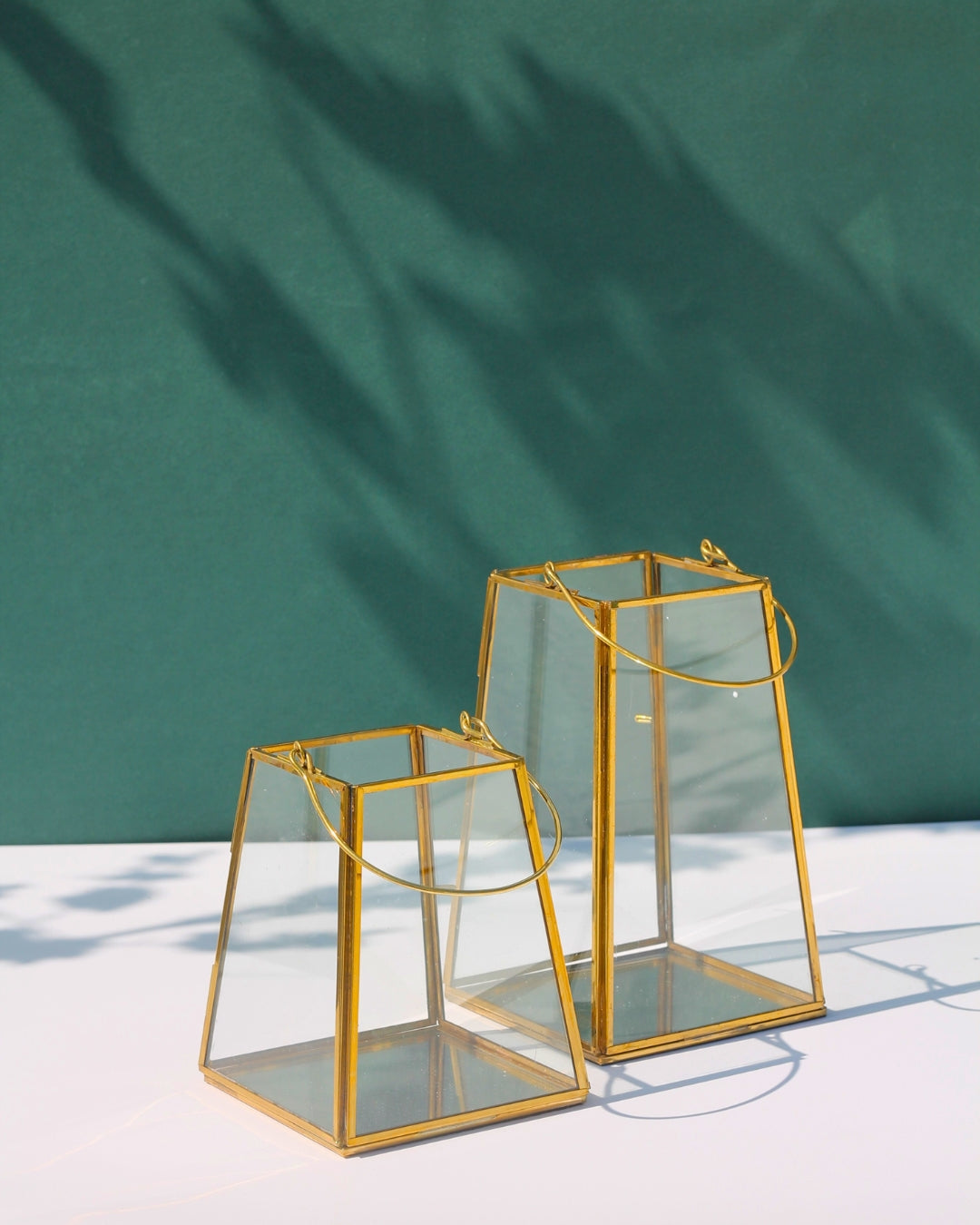 Illuminate your evenings with the Geo Lanterns from SARO, a stunning duo that blends modern geometry with timeless craftsmanship. Handcrafted with brass beading and clear glass panels, these lanterns bring a warm, golden glow to any setting while doubling as luxurious statement accents.