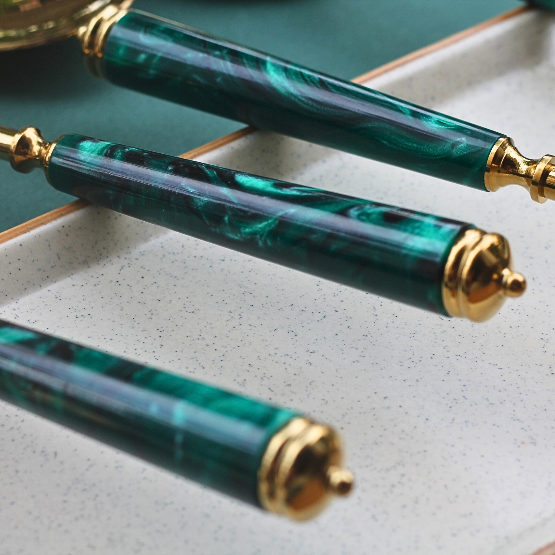 - Material: Gold-polished stainless steel with marbled resin handles