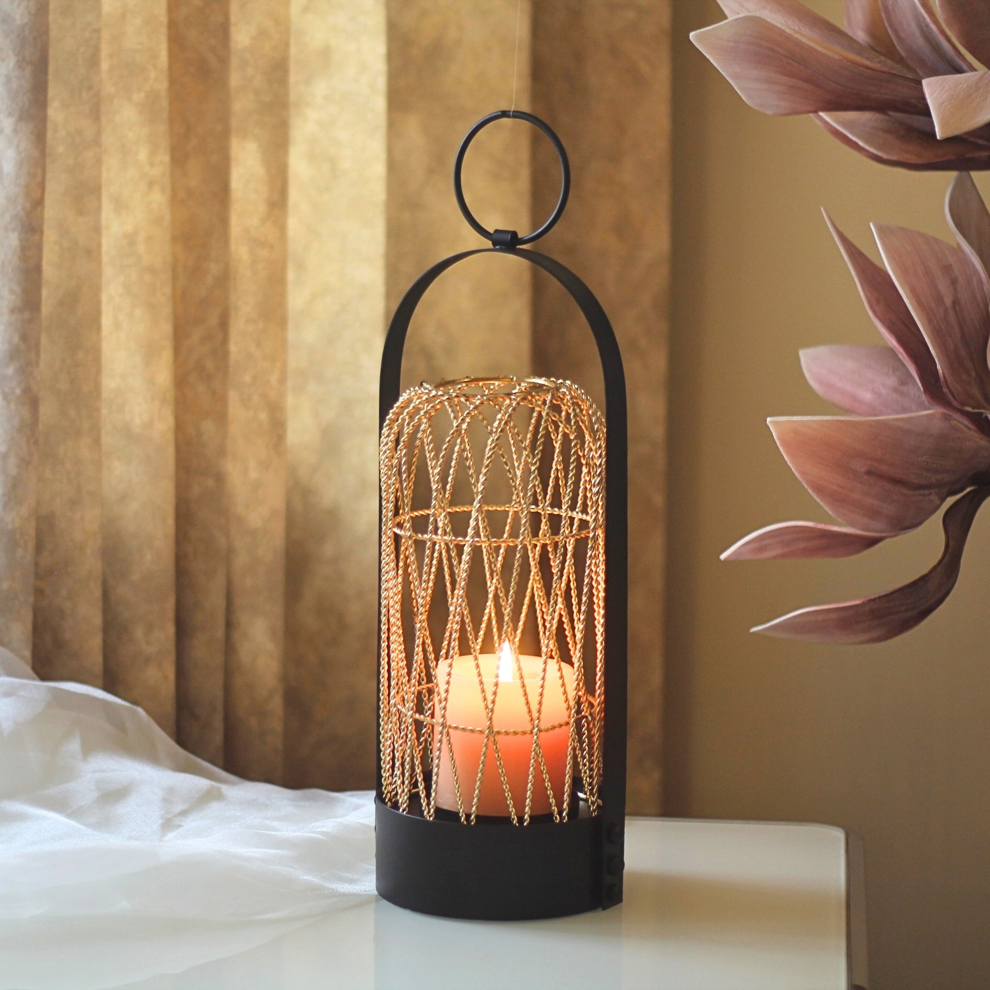 Add a touch of old-world charm with a modern twist through our Pinjore Lantern. Inspired by intricate jali designs, this lantern features a striking interplay of black metal framing and delicately woven golden wires that create a cage-like pattern. When lit with a candle, the Pinjore Lantern casts a warm, patterned glow that instantly elevates any corner of your home.