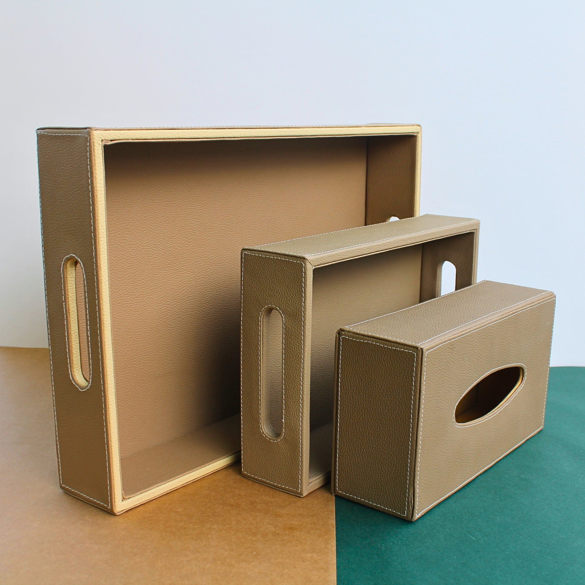 A modern classic for everyday elegance. Handcrafted in beige leatherette with fine stitched detailing, SARO’s rectangular trays and tissue box are versatile accents that balance style and function, ideal for serving, organizing, or styling your home.