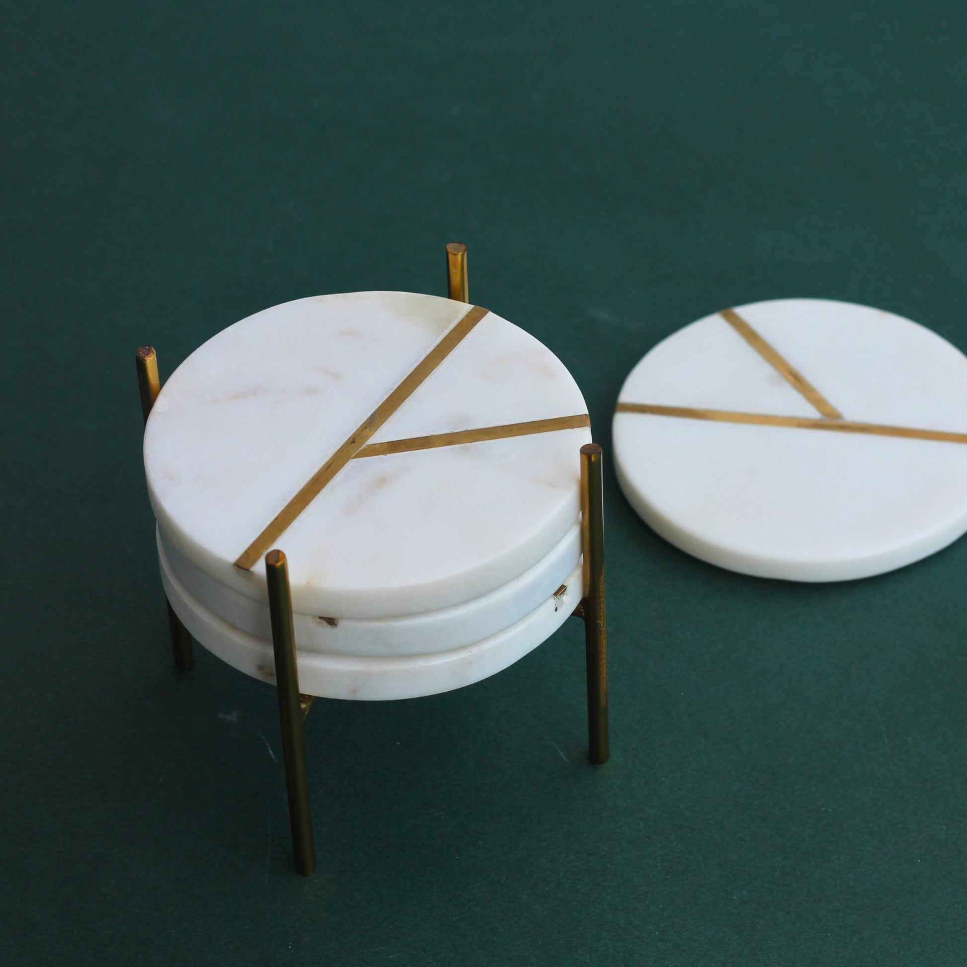 - Includes: 4 round marble coasters with brass inlay + coordinating stand